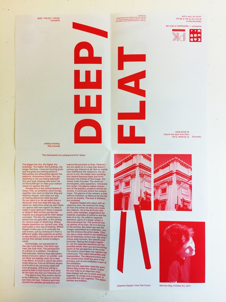 The metropolis as a playground for ideas’ The bigger the city, the higher the buildings. The higher the buildings, the longer the lines. Lines are forming grids and the grids are making patterns. Silhouettes are silhouetted against the patterns. Anonymous forms. Are you watching or are you being watched? Are your eyes drawing new lines? Up on the buildings? Or does your stature stand out against the city? Perspective is the central theme of Deep / Flat, an exhibition which brings together new work by Martine Stig and Stephan Keppel. How does our way of looking determine what we see? Do we zoom in or do we watch from a distance? And how does the way we, observer, determine what we see? Does our glance add new layers? Or does it make it more abstract? Does it expand or distort? Both artists use the metropolis as a playground for their ideas/ concepts. The big city, anonymous or almost too ecognizable, is the setting for various ways of observing. Where Keppel questions our current view, Stig speculates a new way of looking. Where Keppel invites you to re-evaluate the well known, just by looking at it from a different angle, Stig explores an entirely new territory; a world we do not know yet but that already exists in today’s world. Increasingly, our perspective is the view from above. The bird’s eye view, the God-shot. The perspective of a drone or a satellite. The glance that oversees. Martine Stig speculates about a future in which ‘en profile’ and ‘en-face’ are making room for a view from above. A future in which we unlimitedly observe, from all different angles. And in which we are being observed from all angles. Will there still be a place to hide in that future? And what do the eyes see that are following us? The glance that Stig evokes seems to be indifferent. The glance records but does not look. Classical portraits choose the satellite perspective and reduce the portraits to lines. Pedestrians are spied on in a way that doesn’t convey any interest at all. But no matter how indifferent the camera is, the observer is not. No matter how unwilling the camera bounces back and forth between the frames of the image, the viewer looks focused. The observer investigates, asks questions. Interprets the viewer. His glance makes characters of the passers, projects stories on streets, it continues where the camera stops. The glance of the camera, a look without intention, is filled out by the observer as sneaky. The look is limitless, but stressed. Stephan Keppel also plays with an objective view. He removes his images from the artist; he does not create but collects. He is the archivist who sorts; color samples, suggestions for material, examples of patterns and the lines of a city. He collects separate elements, parts of a larger whole; a deconstructed city. The archivist has no opinion of his own. He is in service of the archive. But when you see the images assembled as a collection, you see the choices the artist made. Then you see a vision which is not indifferent but an intensely curious one. Not anonymous and common, but specific and personal. Seeing the images together, not the separate elements but the possible whole, then you are becoming aware of the perspective of the artist. The artist’s vision does not register but constructs. The vision dismantles and reassembles. The deconstruction and the construction itself are part of the process, just as the exhibited is part of the exhibition. Here too the spectator does the work. Where Stig invites the viewer to give his own load to an objective view, does Keppel ask you to stack and fold together, to merge and to expand, to assemble the city together. The opportunities are endless.