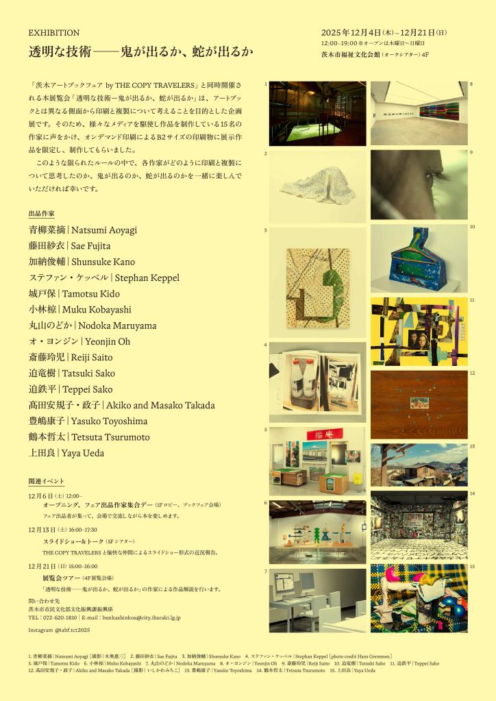 Held concurrently with the “Ibaraki Art Book Fair by THE COPY TRAVELERS,” this exhibition, “Transparent Techniques: Will a Demon Appear, or a Snake?”, is a curated show aiming to explore printing and reproduction from perspectives distinct from art books. To this end, we invited 15 artists who utilize various media in their work and asked them to create pieces specifically for display as B2-sized prints produced via on-demand printing.